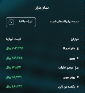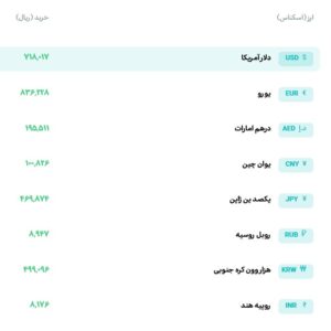 در بازار ارز همچنین قیمت هر اسکناس دلار آمریکا ۷۱ هزار و ۸۰۱ تومان، یورو ۸۳ هزار و ۶۲۲ تومان، درهم امارات ۱۹ هزار و ۵۵۱ تومان و یوان چین ۱۰ هزار و ۸۲ تومان نرخ گذاری شد اما در بازار غیررسمی بهای هر دلار آمریکا حدود ۱۰۸ هزار تومان و هر تتر نیز ۱۰۸ هزار تومان به فروش رفت.