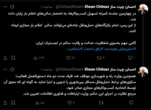وی در ادامه افزود: همچنین وزارت راه و شهرسازی موظف شد ظرف مدت دو ماه دستورالعمل فعالیت سکوی‌های برخط حمل‌ونقل مسافر بین‌شهری را تدوین و اجرا نماید به گونه ای که مجوز آن توسط اتحادیه کسب‌وکارهای مجازی صادر شود. مرجع نظارت بر اجرای این حکم، وزارت ارتباطات و فناوری اطلاعات تعیین شد.